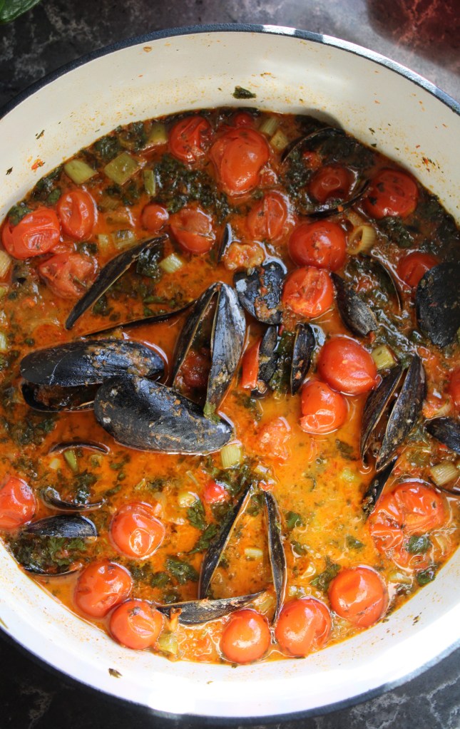 - Once boiling, add in the mussels, stir once, and then cover the pot tightly. Let the mixture cook for 8 minutes; at the 4 minute mark, give the pot a shake without removing the lid.