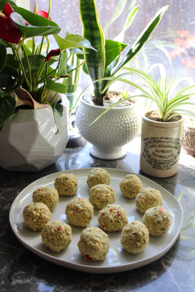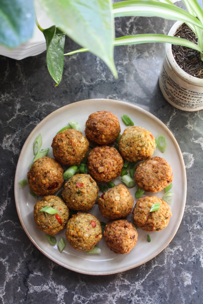 - After hand-combining all of the ingredients, the mix was too wet to be formed into a ball (I think I soaked the peas for too long). I added gluten-free flour incrementally until the mixture was ball-able; it was somewhere around 1/3 cup in total, I think.