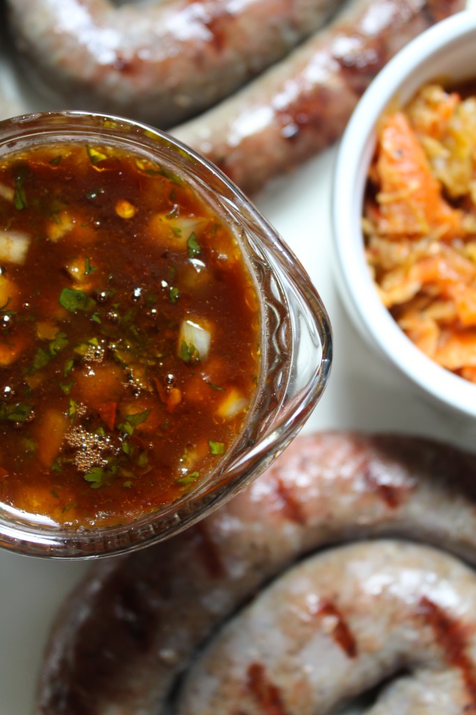 Menu: Boerewors, chakalaka (bean salad), stywe pap (stiff cornmeal), and malva pudding | Recipe Source: africanbites.com, lifewithclottedcream.com, Melissa Mayo, and food.com