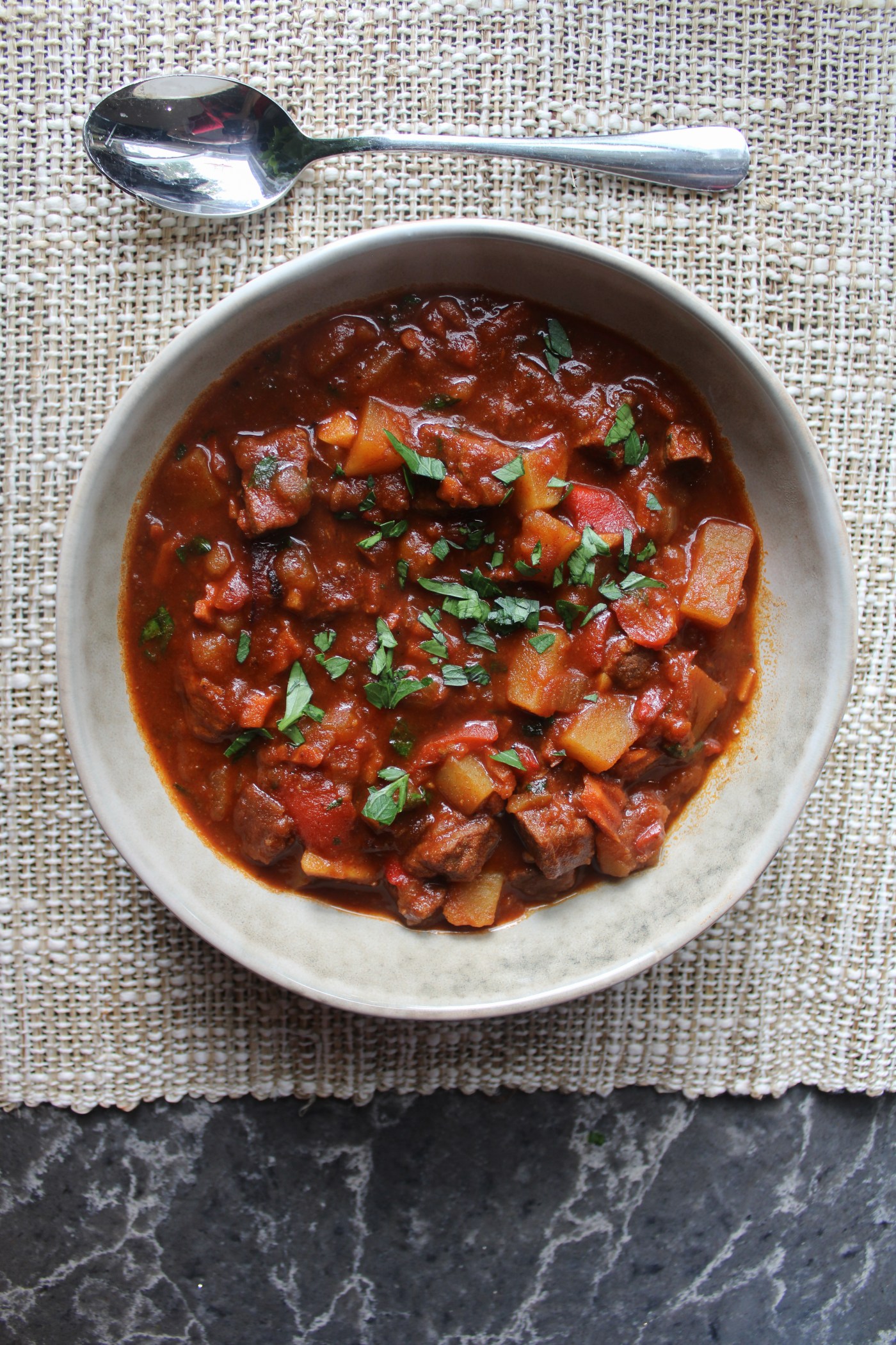 Gulyás: (link): Instead of pork lard, I used frozen duck fat that I rendered last month. I ended up needing an additional 1.5 cups of beef broth, I swapped fresh tomatoes for 3 tbsp tomato paste, and I added some parsley for a pop of green, but otherwise, I followed this recipe exactly!