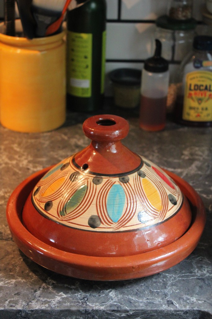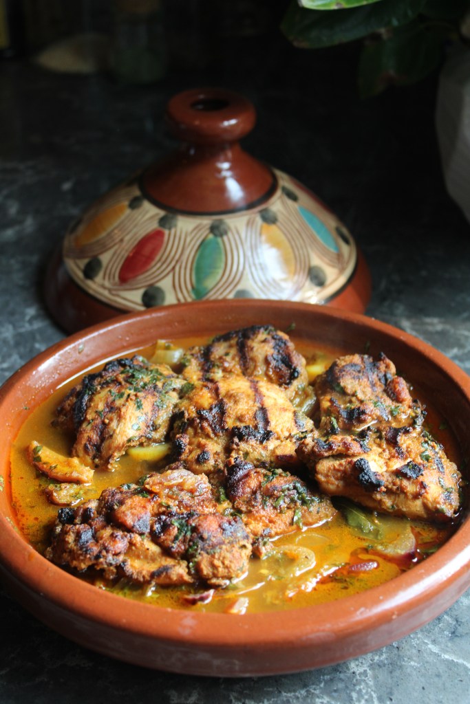 Tajine: (link): I withheld the olives, parsley, and saffron, swapped the preserved lemon for fresh lemon, and used chicken broth (1.5 cup) instead of water. I used a traditional tajine pot but instead of popping it in the oven, I cooked on the stove using a metal diffuser.