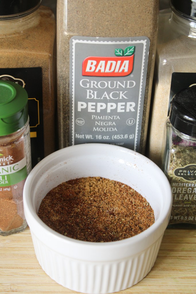 - Spice mix: cumin (3 tbsp), onion powder (3 tbsp), chili powder (4 tbsp), dried oregano (1 tbsp), and black pepper (1 tbsp)