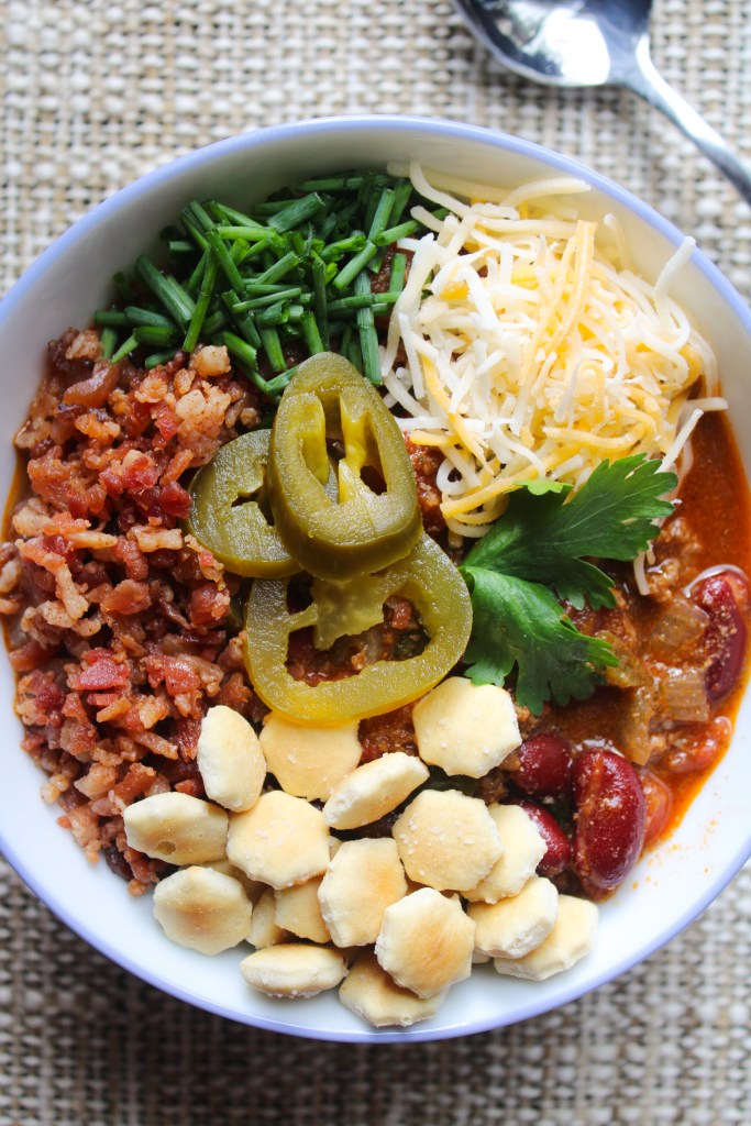- Just like salads, the joy of chili can be found in the toppings. Chopped cilantro, pickled jalapenos or onions, shredded cheese, bacon bits, oyster crackers, sour cream, mashed avocado or guac, tortilla strips, roasted corn salsa, tater tots… the list borders on endless!