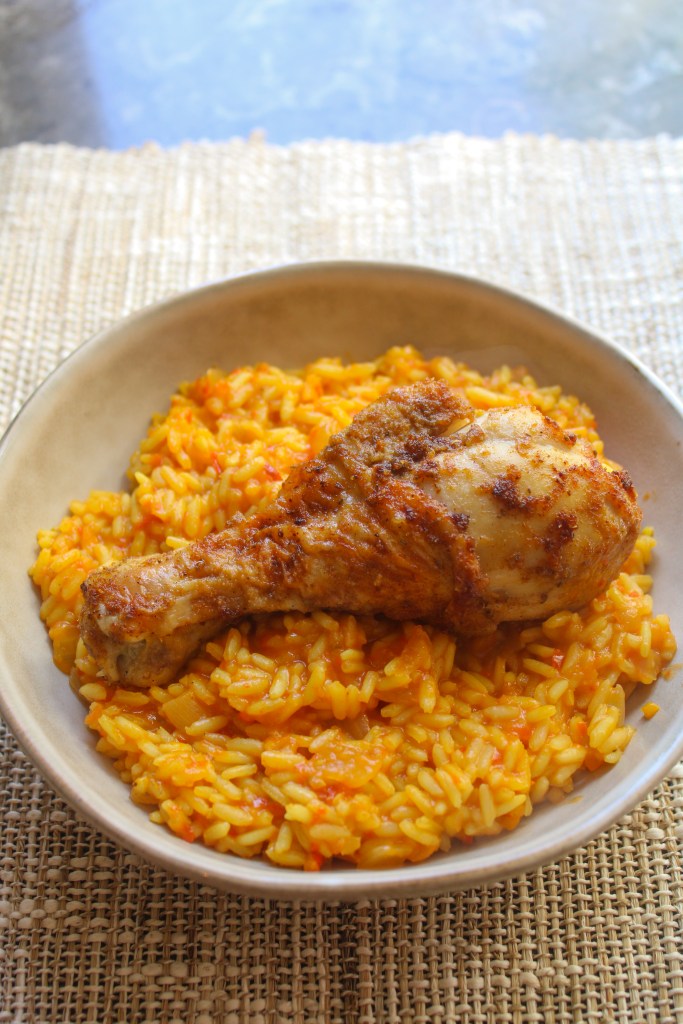 This dinner ended up being a bit of a scramble, but it was completely worth it. My original plan was to make jollof rice (success!) and goat stew (not a success!), but when I started cutting up the goat meat, I realized it wasn’t safe to use (I’ll spare you the details). I had chicken thighs on hand in the fridge and an excess of African spices in my pantry from previous rounds of Cooking Around the World, so I made a last-minute pivot and whipped up African-inspired baked chicken legs instead of the stew. The chicken seasoning was delicious and the jollof rice was indescribably good -warm, earthy, hearty- and I’d place this meal very high in the Chicken and Rice Hall of Fame (alongside Spanish paella and Cuban arroz con pollo).