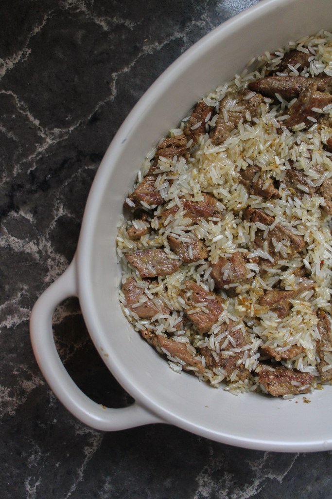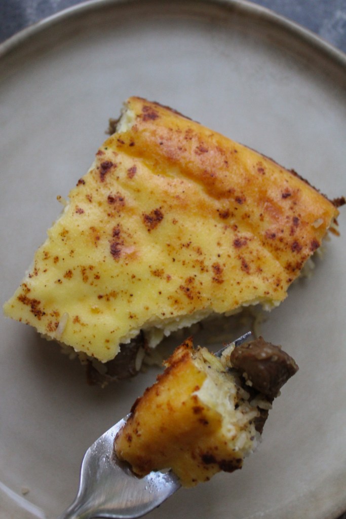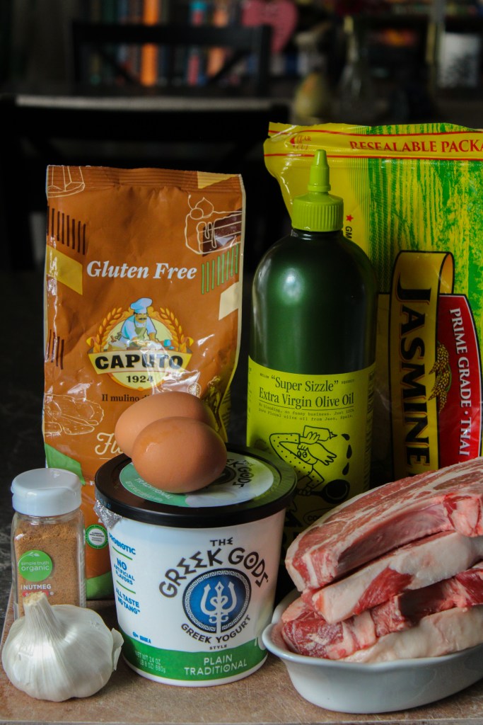 Tavë kosi: (link): I split the difference between two recipes: the one linked to the left, and this one from the BBC. I was slightly light on lamb after removing all of the gristle so I ended up using 45g rice to make up the difference. I simmered the lamb and garlic mixture with a bay leaf, used 6 grated garlic cloves instead of 2 crushed, and used a mixture of bouillon and salt instead of just plain salt. I also used a vegan butter replacement instead of real butter, and after adding the rice and lamb mixture to the baking crock, I squeezed a little lemon over top before pouring the roux and yogurt sauce.