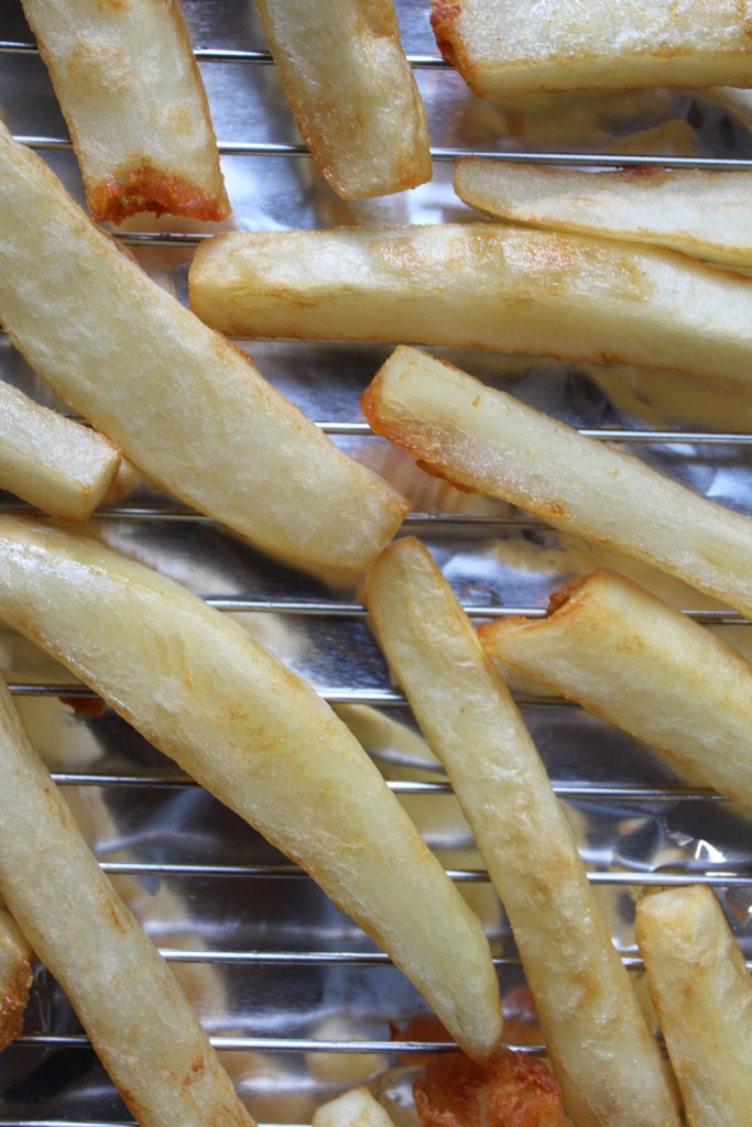 - For the fries, instead of following the link above, I used my all-time favorite French fry recipe from SeriousEats that I first stumbled across earlier this year when I made fish and chips for England. It uses the exact same number of potatoes and rounds of frying as the Seasons & Suppers recipe does, but it calls for the addition of white vinegar and two trips to the freezer (both of which make the fries soft on the inside but extra crackly on the outside, almost as if they’ve been battered).