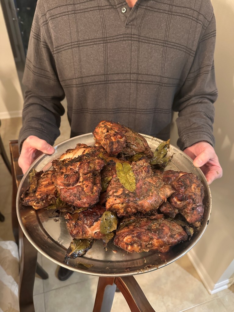Menu: Jerk chicken, sweet plantains, and beef patties | Recipe Source: butterbeready.com, seriouseats.com