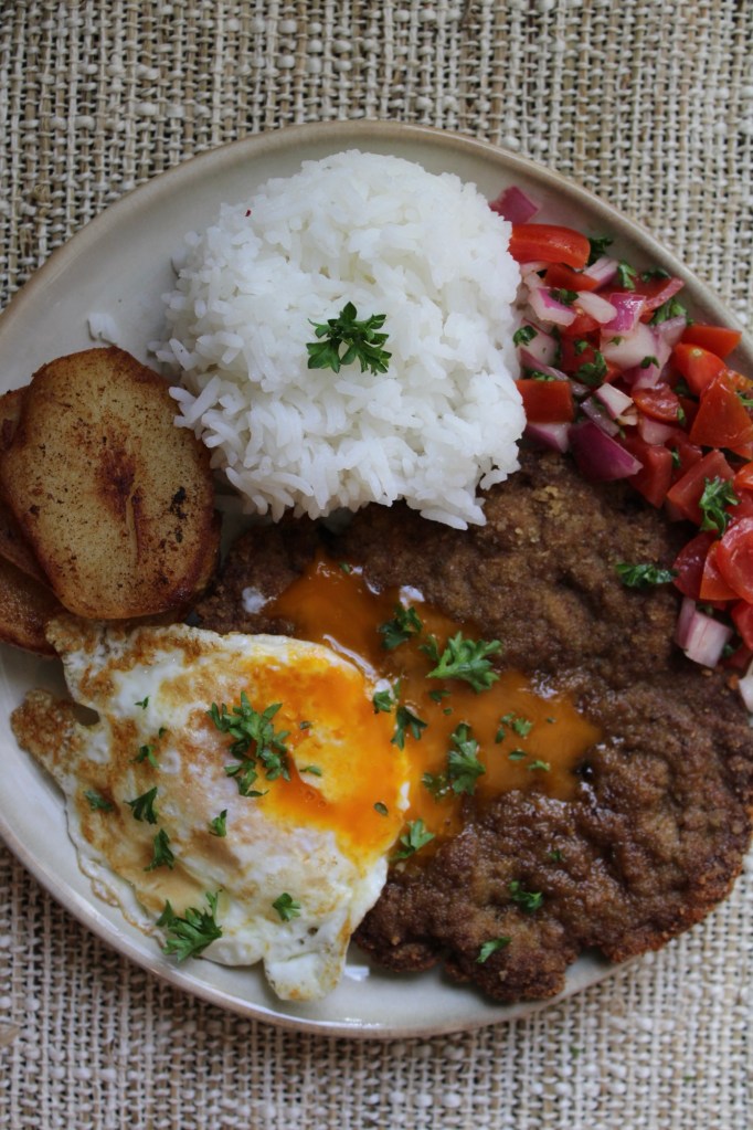 A crispy beef patty, a scoop of white rice, fried potato rounds, a runny egg, and vinegary tomato-onion salsa. Those are the bones of silpancho, and if you’re like me and love all of those foods individually, believe me when I tell you that they’re even more lovable when they’re all mixed together on one heaping platter. I still can’t decide if it’s the egg, the potatoes, the frying, or the plating of it all, but when I first came across silpancho, something about it screamed “hangover cure” to me. For that reason, I immediately assumed it was a breakfast dish, and while it turns out that silpancho is a prized Bolivian lunch and dinner special, I really think they should look into serving it in the morning because if I wandered into a diner dehydrated and fighting a headache and saw it on the menu, it would feel like someone was throwing me a life preserver. Needless to say, I loved this one; and while I don’t know if I’d make it again in its entirety, I will absolutely be making the spiced beef and breadcrumb patties and the salsa again in the future!