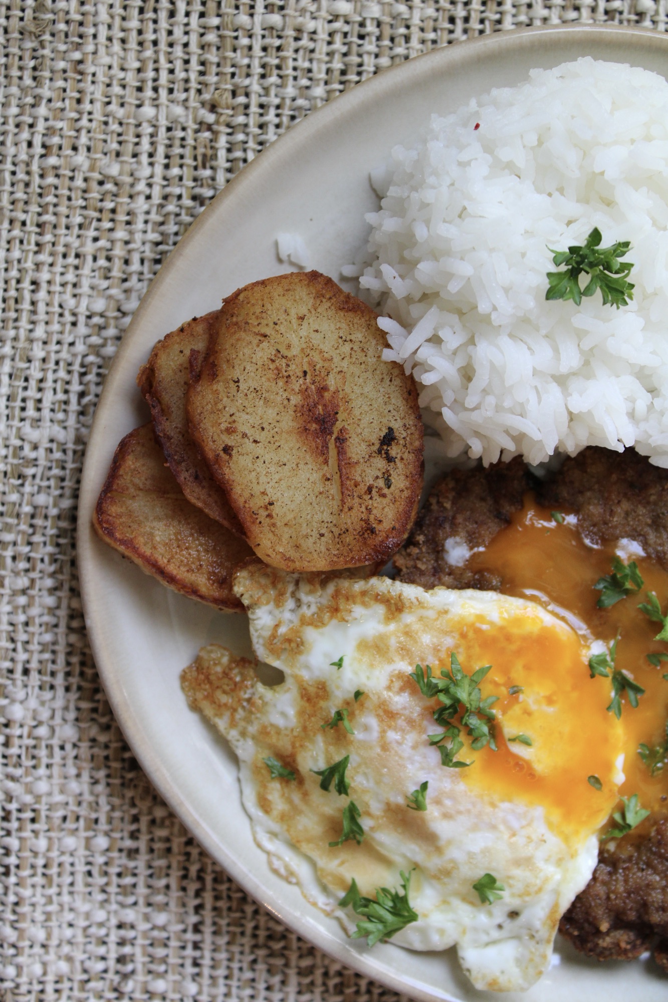 A crispy beef patty, a scoop of white rice, fried potato rounds, a runny egg, and vinegary tomato-onion salsa. Those are the bones of silpancho, and if you’re like me and love all of those foods individually, believe me when I tell you that they’re even more lovable when they’re all mixed together on one heaping platter. I still can’t decide if it’s the egg, the potatoes, the frying, or the plating of it all, but when I first came across silpancho, something about it screamed “hangover cure” to me. For that reason, I immediately assumed it was a breakfast dish, and while it turns out that silpancho is a prized Bolivian lunch and dinner special, I really think they should look into serving it in the morning because if I wandered into a diner dehydrated and fighting a headache and saw it on the menu, it would feel like someone was throwing me a life preserver. Needless to say, I loved this one; and while I don’t know if I’d make it again in its entirety, I will absolutely be making the spiced beef and breadcrumb patties and the salsa again in the future!