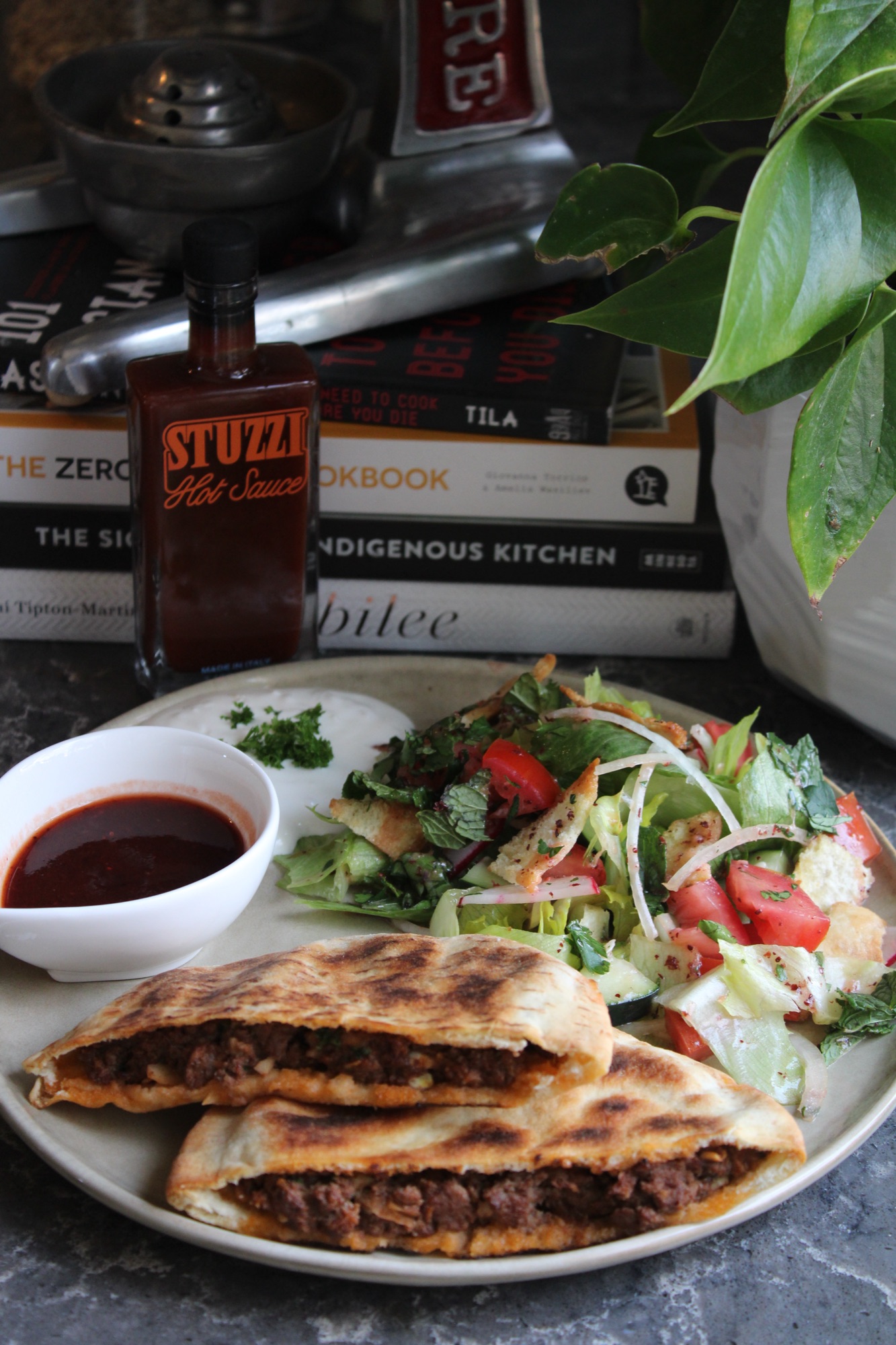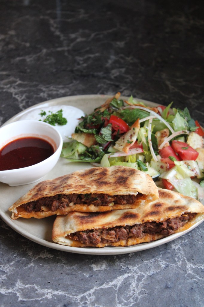 Meat stuffed pitas are a popular Middle Eastern street food that go by many names, but in the Levant, they’re called arayes. Onions, garlic, baharat, and ground beef or lamb are mixed together, stuffed into olive oil-brushed pitas, and then baked until golden brown and fragrant. The dish is usually served with a variety of dipping sauces—garlicky yogurt, hot sauce, tahini, etc.— and paired with a refreshing salad to balance out the heaviness of the fried pitas and meat. For my attempt at this Lebanese staple, I went with ground lamb for the arayes, fattoush for the salad (romaine, tomatoes, cucumber, radish, onion, and homemade pita chips dressed in lemon juice, sumac, and pomegranate molasses), garlicky yogurt from my favorite Persian grocery store, and a spicy honey-sumac-harissa sauce. The arayes were crispy, savory, and slightly greasy in the best possible way, and the fattoush and mast-o-moosir yogurt sauce both added a tart, fresh pop on the side (while the spicy dip provided some zing). The sharab el ward was the perfect summer drink—lemony, sweet, subtle, and floral—and all in all, this was hands down one of the best meals of this project, and I can’t wait to make it again!