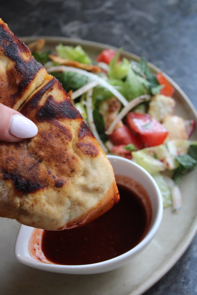 Arayes (link): I made a few minor changes to this one. Based on another recipe I saw, I added 1 tbsp chopped mint and 1/2 tbsp pomegranate molasses to the filling mixture, and also opted to use both freshly ground allspice and baharat (7 spice) instead of choosing between them. I added 1.5 tsp cumin and skipped the chili paste (I wanted to make a spicy sauce on the side) and paprika entirely.