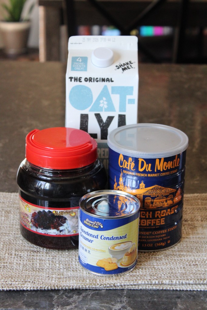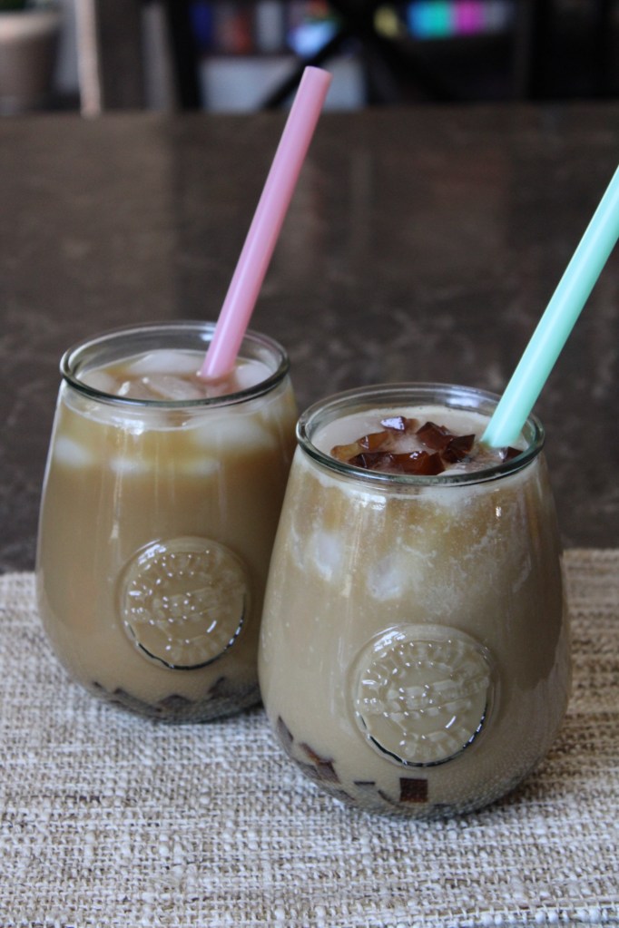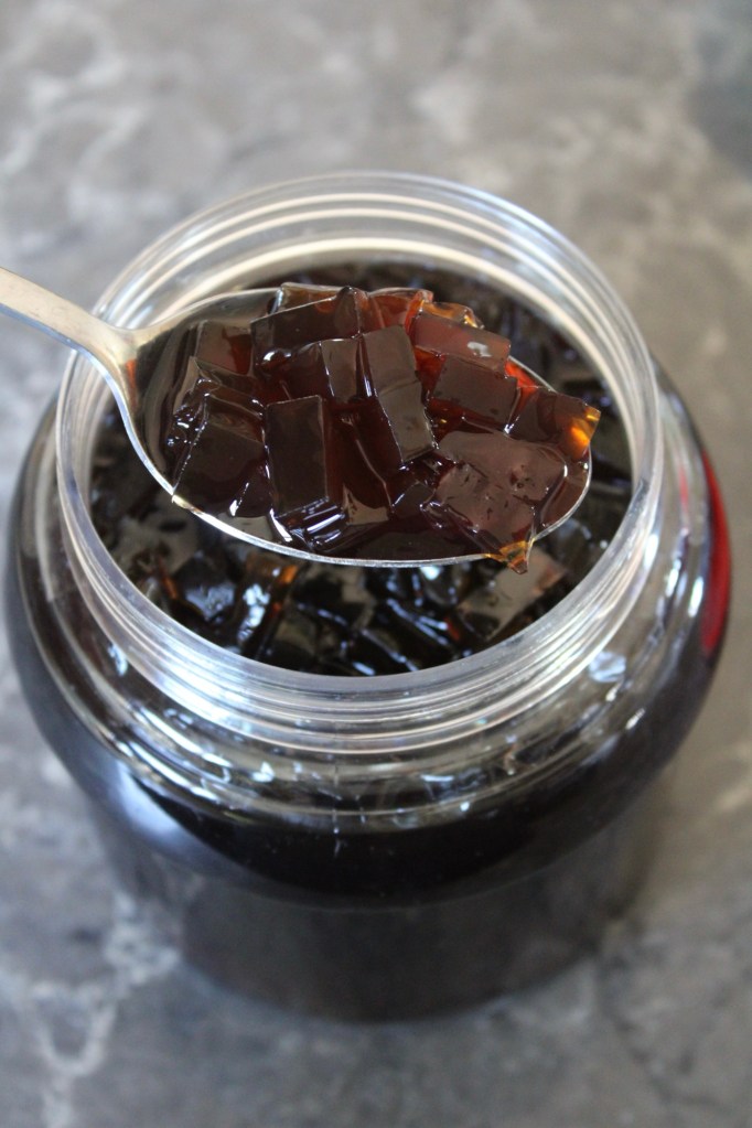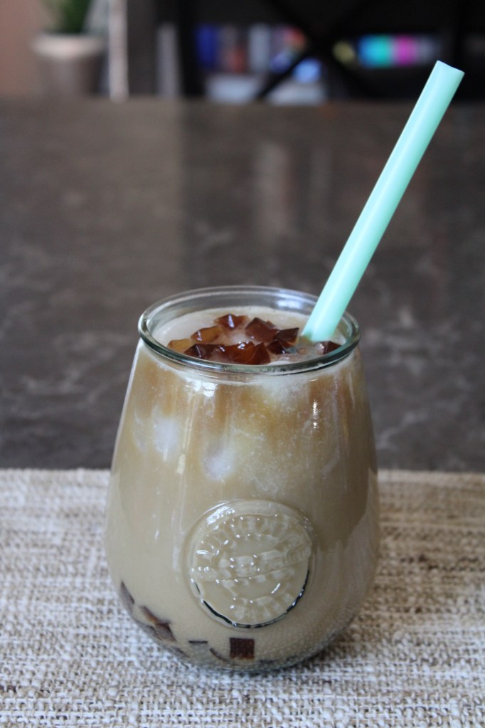 Jelly Coffee: I bought pre-made coffee jelly from H-Mart and brewed a pot of regular strength Cafe du Monde coffee. I added dairy-free condensed milk to my glass and stirred in the coffee jelly cubes (plus syrup from the jar), then added 1/2 cup oat milk, stirred until well combined, and then added ice. I poured black coffee over the milk mixture, added my straw, and then garnished with another small scoop of coffee jelly.
