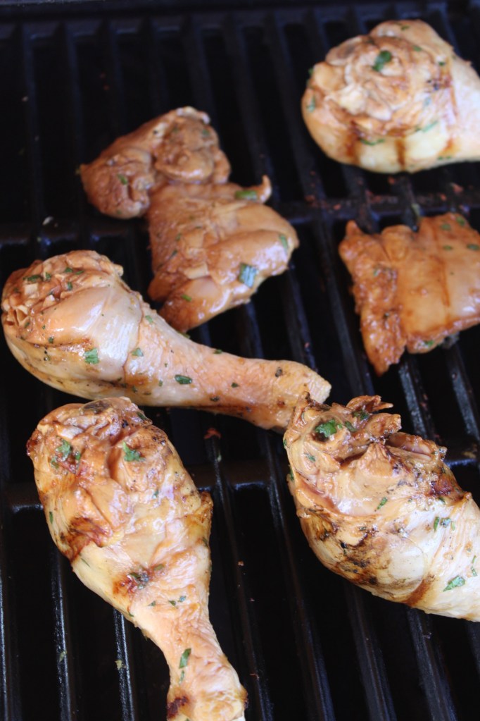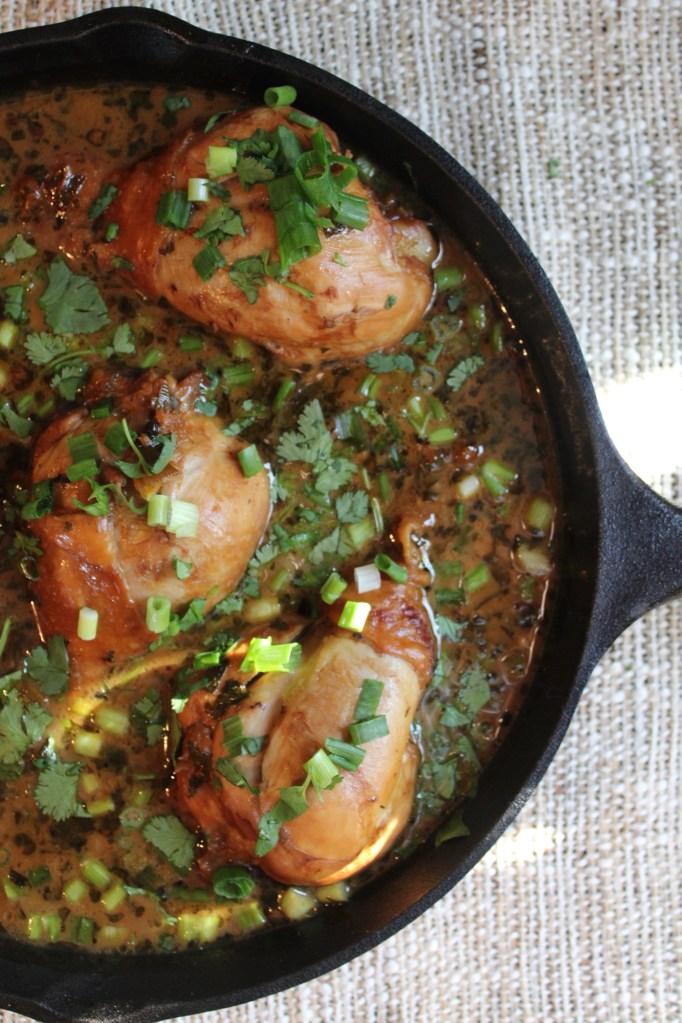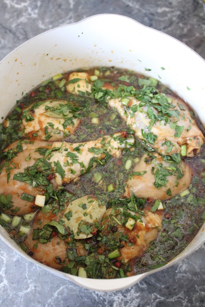 Adobo Chicken (link): I followed the adobo marinade recipe exactly aside from adding some chopped cilantro and swapping 1/2 the black peppercorns for sichuan peppercorns. I grilled the chicken pieces at 500 instead of browning them on the stove, and I ended up only needing 1/4 of the simmering time as a result.