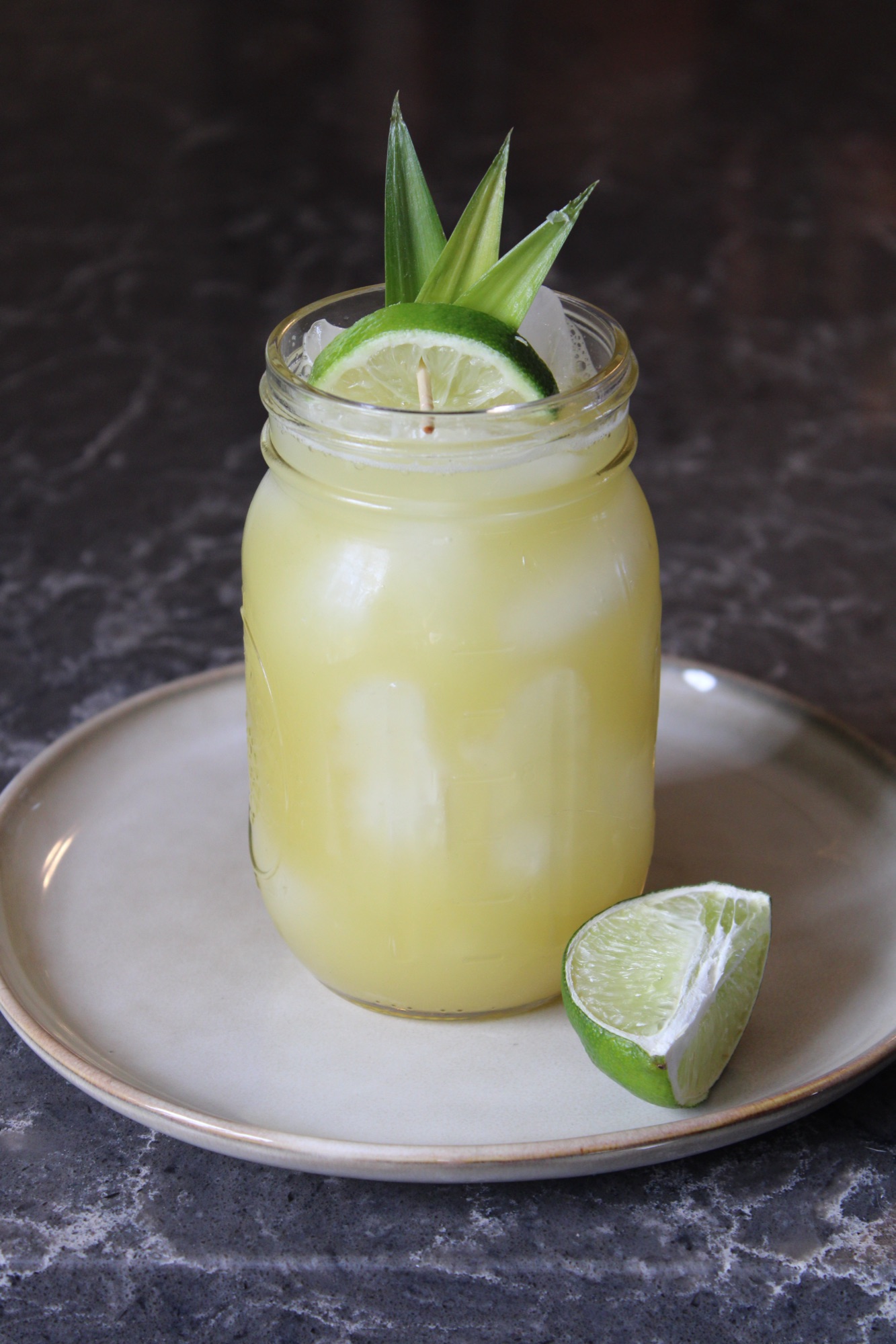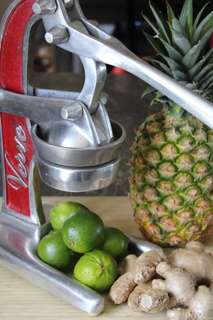 Pineapple-Ginger-Lime Juice: As is typically the case with simple juices, I winged it! I used one whole pineapple, 2 small ginger roots, and 3 limes’ worth of juice. I hand juiced the pineapple and added the liquid + 3tbsp of pineapple flesh to my blender cup, then poured in the lime juice and the peeled ginger root. I pulsed for about 30 seconds, poured the mixture through a strainer, and then added water and agave to my liking.