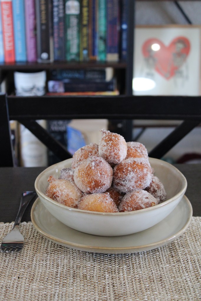 Yovo Doko (link): This recipe called for 500g of all-purpose flour; I went with only 475g and used 25g Bird’s Custard Powder (unsweetened, so basically just corn starch) to make up the difference. Instead of 400ml of warm water, I did 100ml full-fat oat milk and 300ml water, and before adding the liquids to the dry ingredients, I added a hefty dash of vanilla. I let the batter rise for about an hour and 20 minutes and I fried in lard, not oil; and after toweling off the fresh donuts, I gave them a quick roll in white table sugar!